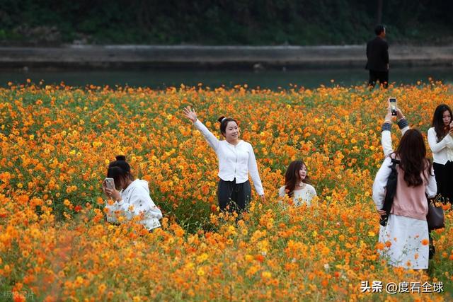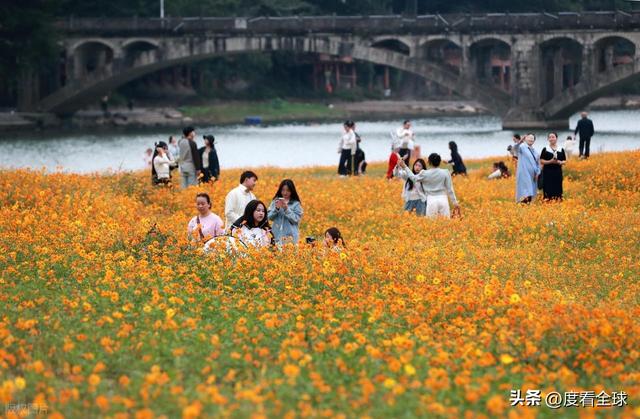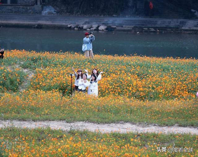 此次绽放的硫华菊,以纯粹的金黄为主色调,偶尔点缀几抹橙红,成片成片地铺展在开心岛的土地上,形成了一片一望无际的金色海洋。远远望去,花海与蓝天、白云相映成趣,近处则与侗寨特有的青瓦木楼、参天古榕构成了一幅绝美的山水画卷,每一处景致都充满了诗情画意。
