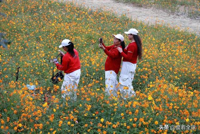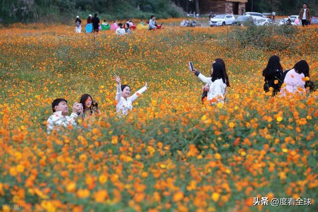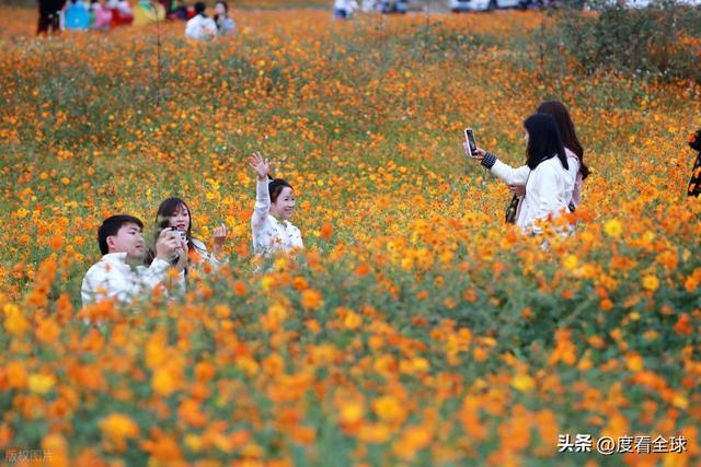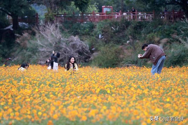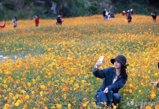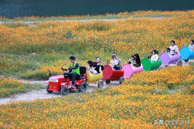 对于游客而言,这片花海不仅是视觉上的盛宴,更是沉浸式体验的绝佳场所。沿着花海中的小径漫步,硫华菊的芬芳扑鼻而来,沁人心脾。游客们纷纷拿出手机、相机,在花海中寻找最佳角度,记录下这美好的瞬间。有的游客身着靓丽的服饰,在花丛中摆出各种造型,定格与深秋的亲密接触;有的则选择乘坐复古小火车,沿着花海中的轨道缓缓前行,仿佛穿梭在金色的童话世界里,尽情享受着这份惬意与浪漫。无论是年轻的情侣、结伴而行的闺蜜,还是带着孩子的家庭,都能在这里找到属于自己的乐趣,感受深秋的独特魅力。